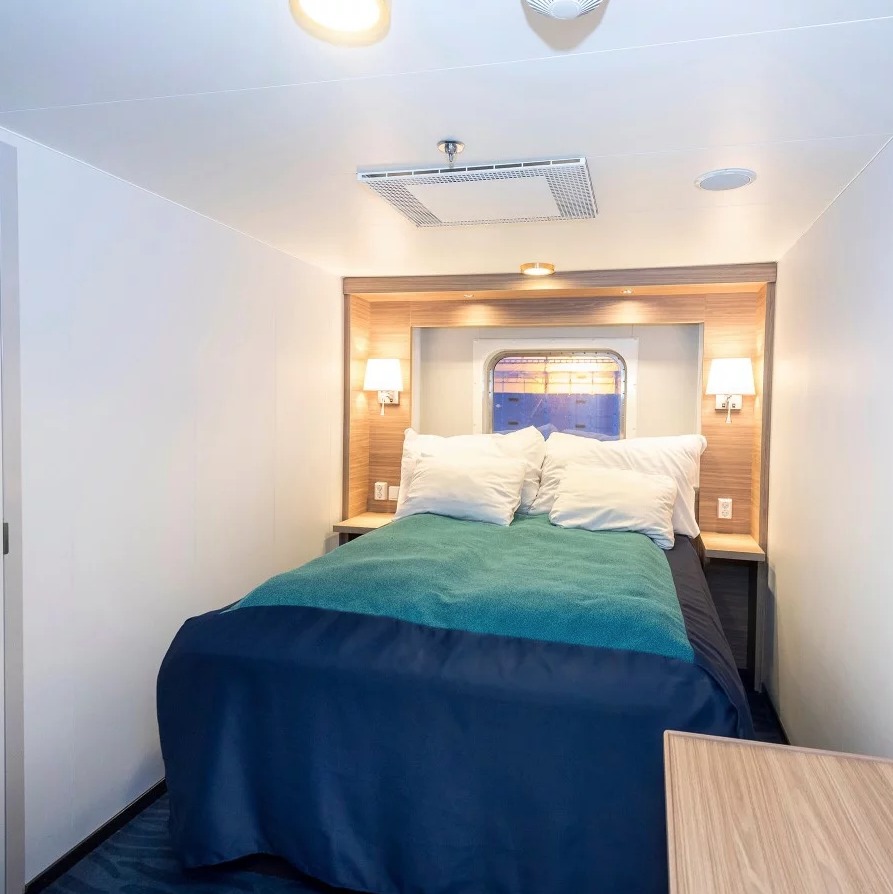 This wheelchair accessible cabin on the upper deck has a wider door and adjusted bed. The cabin has a double bed, bathroom with shower and WC, and TV. This cabin has a limited view.(We have a limited number of wheelchair accessible cabins, so we ask that they are booked by guests who require these cabins. Please inform us in advance of your disability - you will find Hurtigruten contact information on the Booking Confirmation document.)