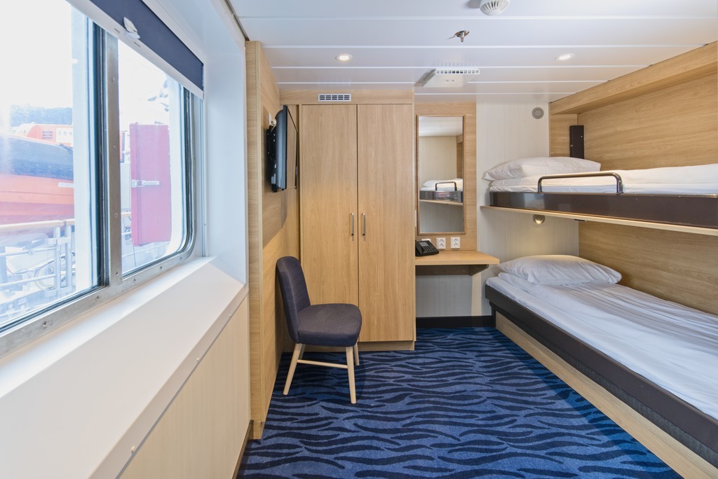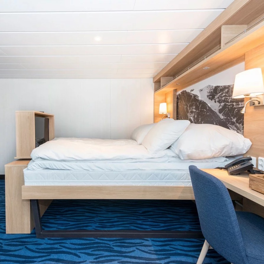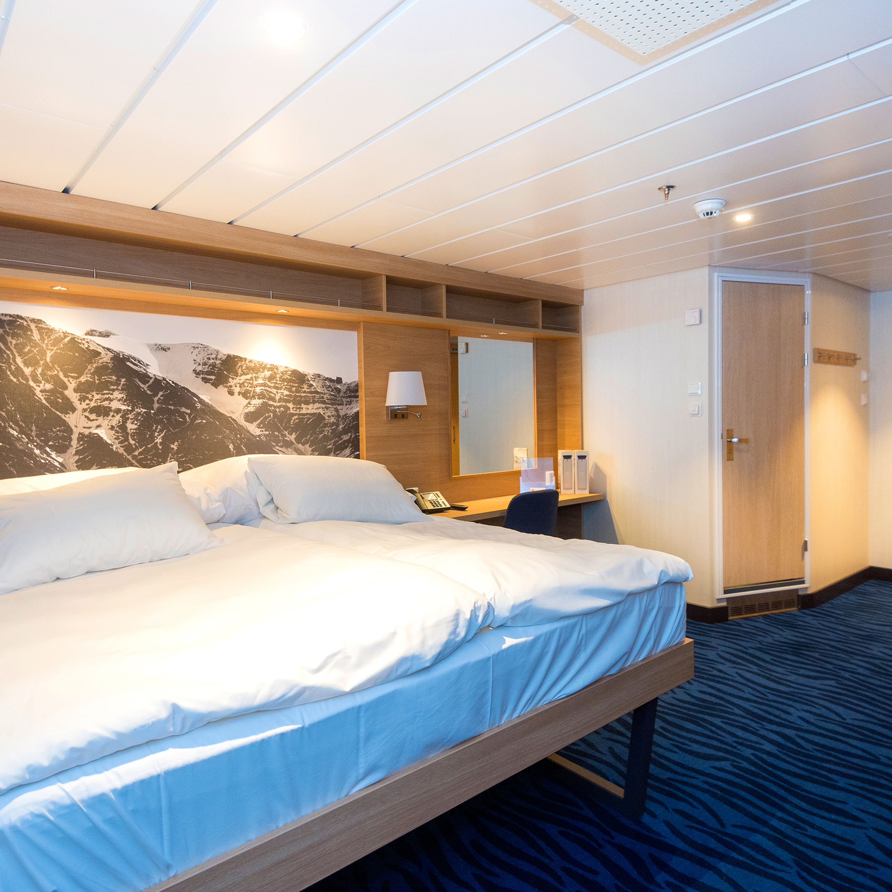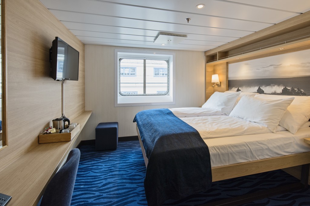 Arctic Superior cabins are comfortable cabins∘ situated on both upper and middle deck, where you can enjoy a relaxing atmosphere. All the cabins have bathrooms with shower/WC. You will also find coffee and tea facilities in these cabins. Smaller Outside Arctic Superior cabin with double bed, TV, table and kettle.