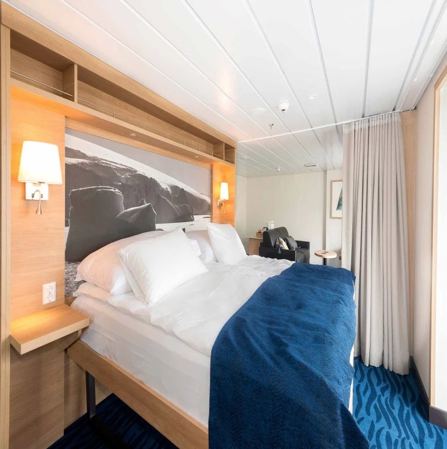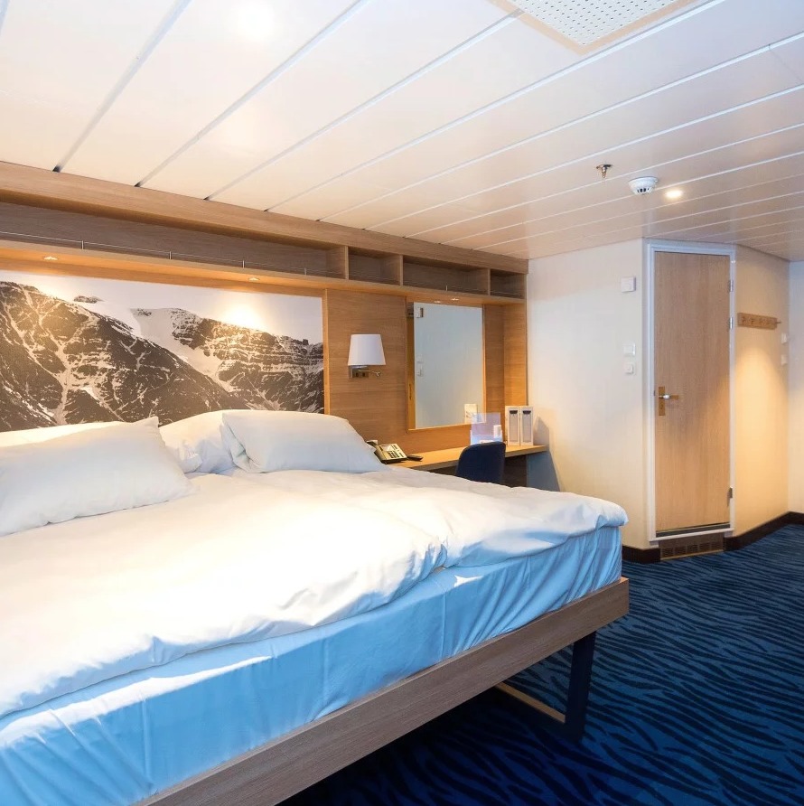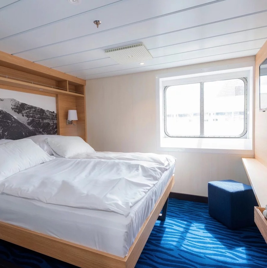 Arctic Superior cabins are comfortable cabins situated on both upper and middle deck, where you can enjoy a relaxing atmosphere. All the cabins have bathrooms with shower/WC. You will also find coffee and tea facilities in these cabins. Outside Arctic Superior cabin with double bed, TV and kettle. Window view is party obstructed.