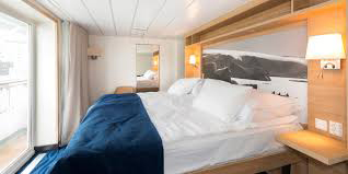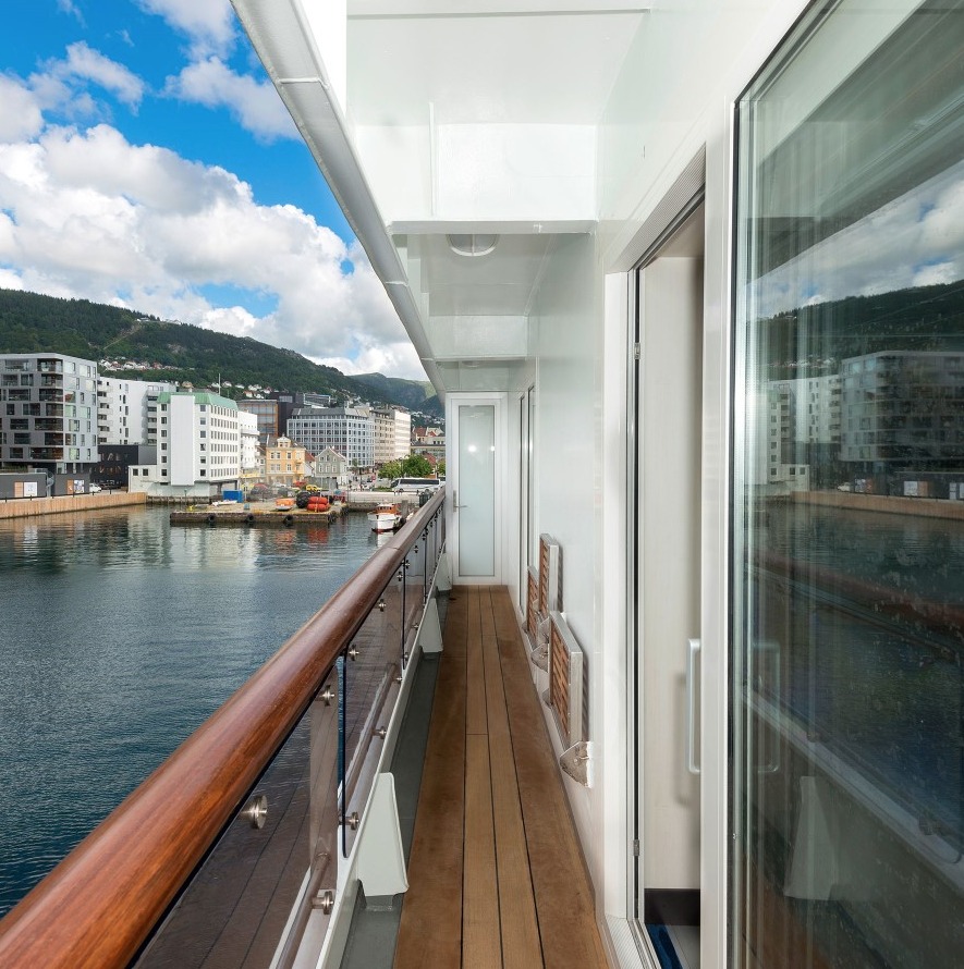These exclusive suites on the upper deck have a double bed, a separated seating area, TV, kettle, tea/coffee, stereo, minibar, bathrooms with shower/WC, and a spacious private balcony. The first minibar setup is included for each item, each replenishment is chargeable.Please note that we have a wheelchair accessible cabin within this category, please contact us to book.