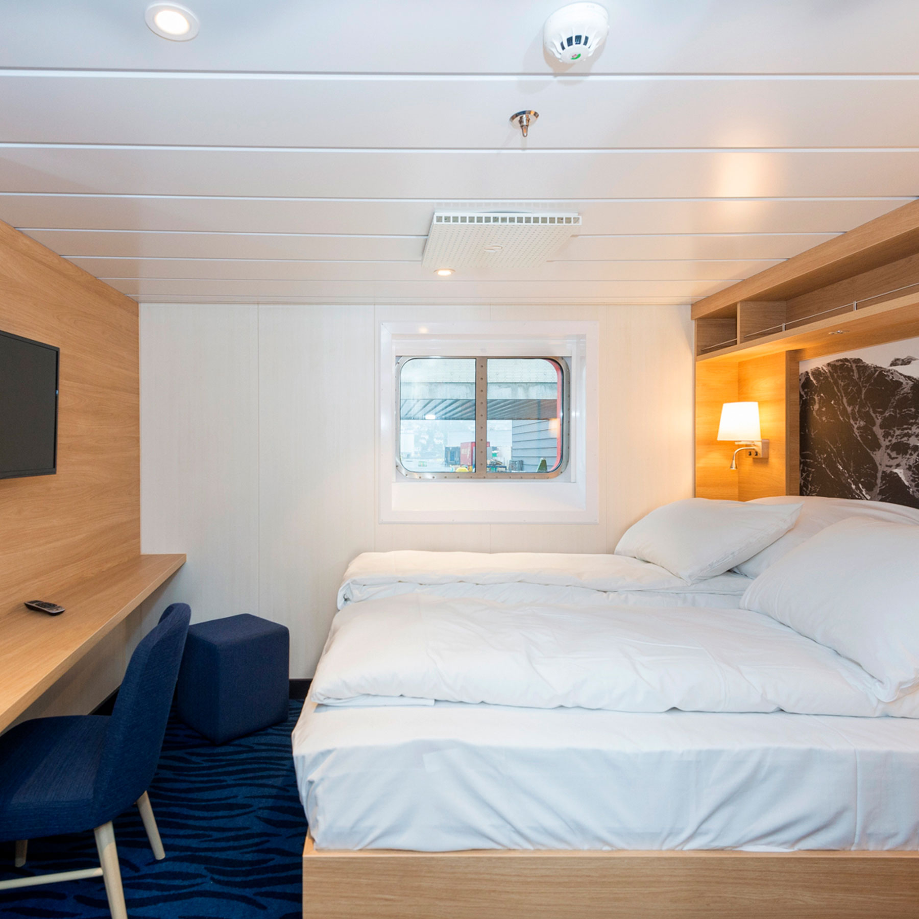 Our cosy Polar Inside cabins can be found on all decks. All cabins include bathrooms with shower/WC. Spacious inside cabin for four travellers, with one double bed and TV.