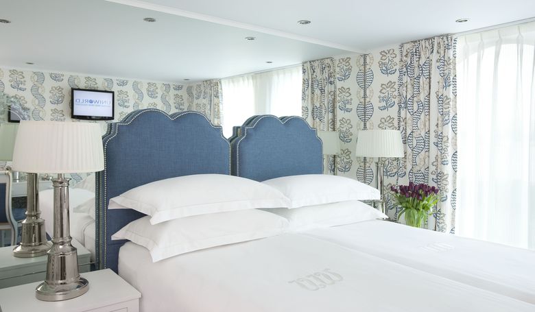 Lavishly appointed riverview stateroom (151 sq ft - 14 sq m)Handcrafted Savoir® Beds of England, built-in closet, hair dryer, safe, individual thermostat, flat-screen TV with infotainment centre and satellite∘, and bottled waterMarble bathroom with Asprey bath and body products, plush towels, waffle bathrobes, and slippers